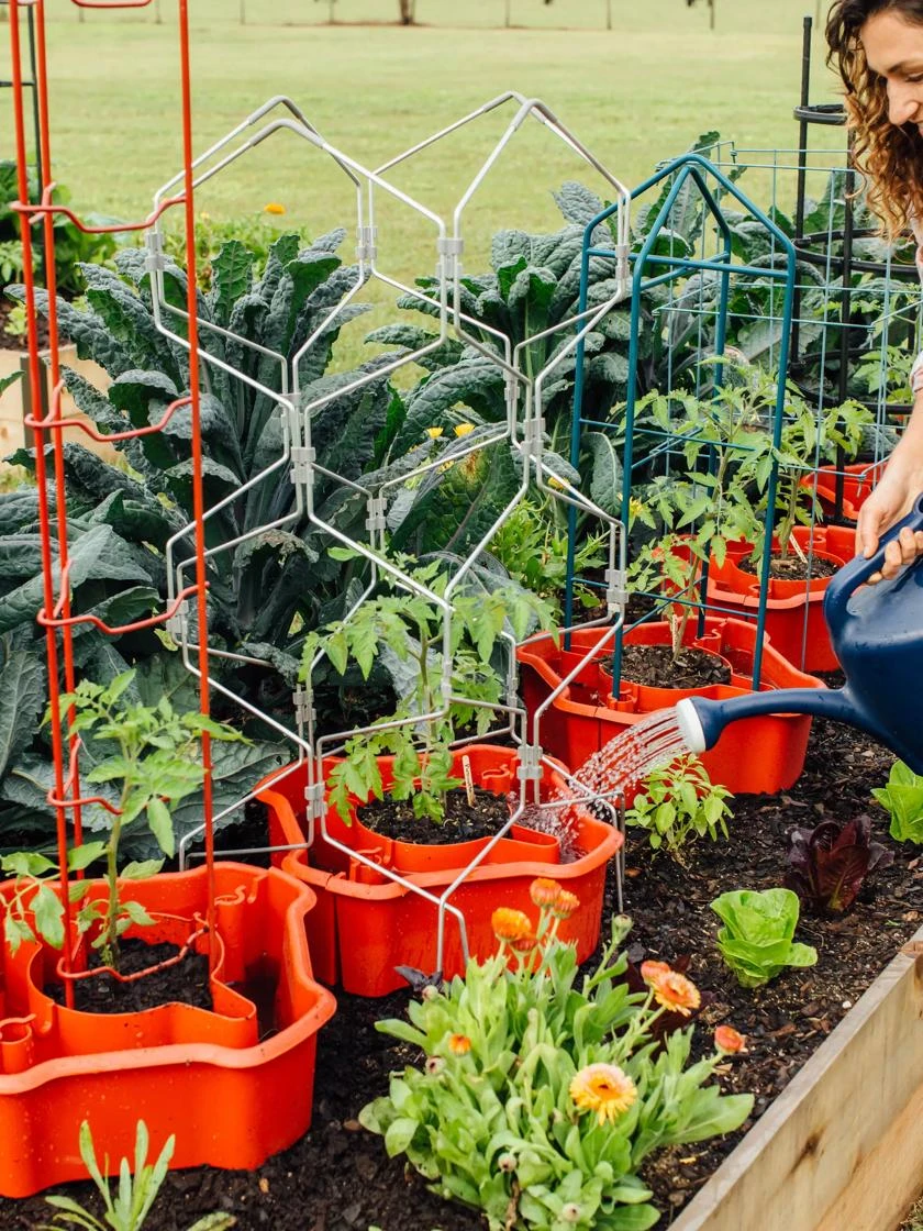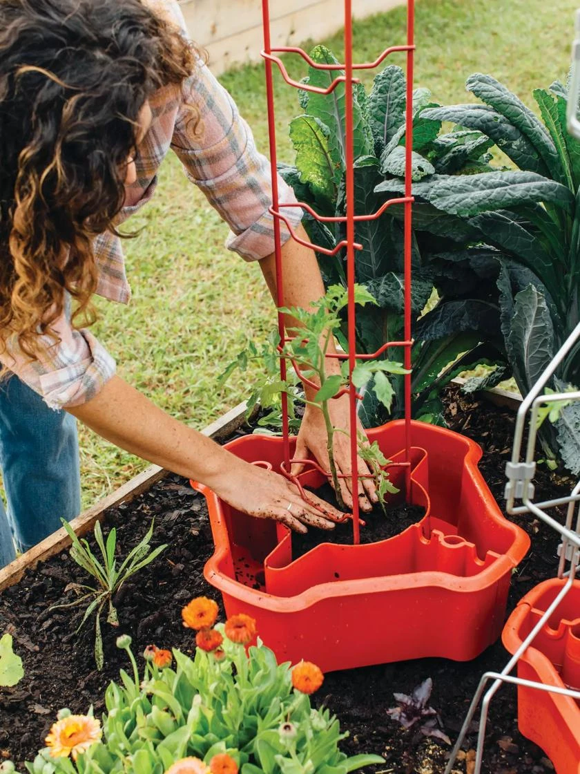 The two-piece design allows for use with a new or existing, already established plant. Higher walls protect stems, fend off cutworms, and discourage weeds. The base reservoir holds two gallons of water which releases water directly to the root zone. Tomatoes are notoriously thirsty plants so this feature is key!