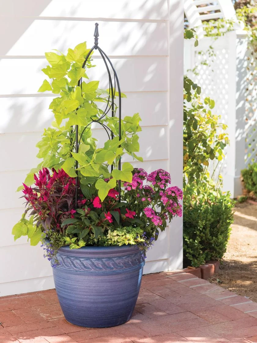 Imagine Juliet in the garden gazing deeply into Romeo’s eyes — this darling obelisk could have been plucked right from her Italian garden! Use it in flowering containers or garden beds and plant up something unexpected! Container sold separately.